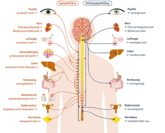 Wir verfügen über ein zweites System, welches Emotionen und Gefühle mit dem Körper verbindet. Das autonome Nervensystem gliedert sich in mehrere Teile: