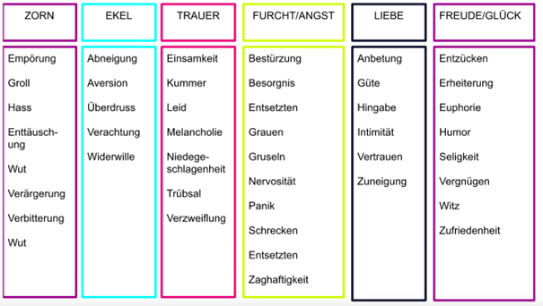 Die Psychologie hat mittlerweile eine Liste von Emotionen erstellt, die universell und kulturübergreifend sind. Demgegenüber sind Gefühle individuell und werden von Erfahrungen und erlebter Kultur geprägt. Eine Emotion kann binnen Sekunden kommen und gehen. Ein Gefühl wie Trauer hingegen kann über Wochen oder Monate präsent sein.